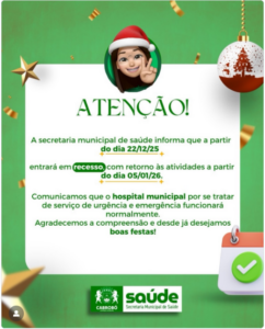 A secretaria municipal de saúde, entrará em recesso no período de 22/12/2025 a 05/01/2026.