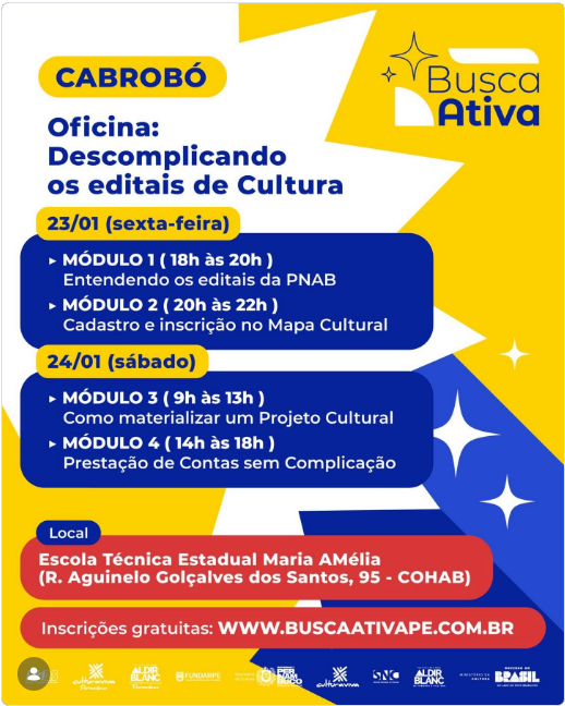 Está aberto, até o dia 20 de dezembro, o período para envio de sugestões de agendas da Busca Ativa (@buscaativape) nos 45 municípios participantes! Se você é de Cabrobó e região, é fazedor de cultura, gestor público ou agente cultural, pode indicar espaços, projetos e iniciativas do seu território que você considera importantes para o