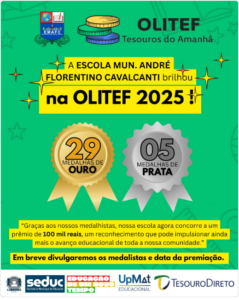A Escola Municipal André Florentino Cavalcanti comemora um dos maiores feitos de sua trajetória educacional: a conquista de 29 medalhas de ouro e 5 medalhas de prata na edição 2025 da Olimpíada de Tecnologia e Educação Financeira (OLITEF). O desempenho excepcional dos estudantes coloca a unidade escolar entre as mais premiadas do município e destaca o compromisso da comunidade escolar com a excelência acadêmica.