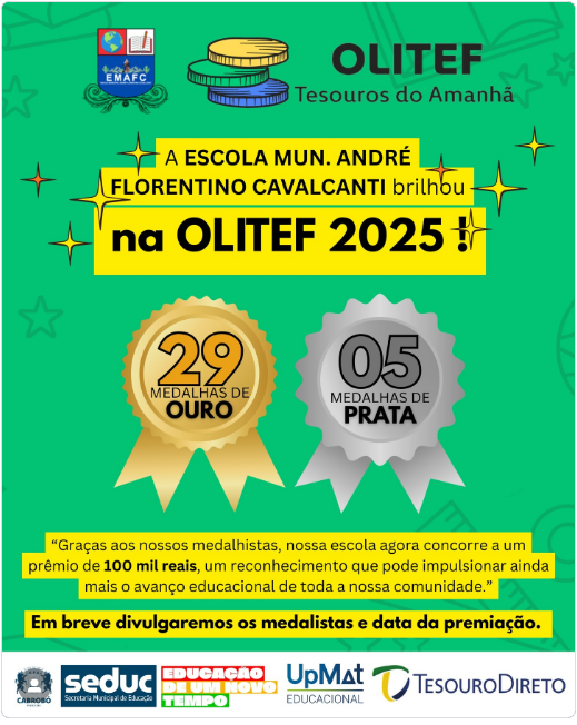 A Escola Municipal André Florentino Cavalcanti comemora um dos maiores feitos de sua trajetória educacional: a conquista de 29 medalhas de ouro e 5 medalhas de prata na edição 2025 da Olimpíada de Tecnologia e Educação Financeira (OLITEF). O desempenho excepcional dos estudantes coloca a unidade escolar entre as mais premiadas do município e destaca